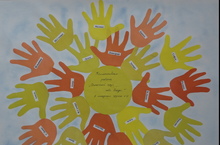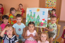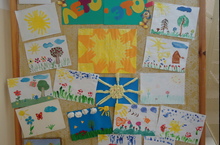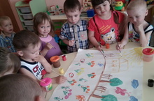 Коллективная работа по аппликации детей второй младшей группы №2 на тему "Солнечный круг - небо вокруг". 18.06.2013 "Ярко солнце светит. В воздухе тепло. И куда не глянешь. Все кругом светло". В ходе работы дети учатся выполнять работу коллективно, составлять простейшую композицию, а также приходят к пониманию, что результат общей работы зависит от усилий каждого.