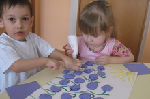 Дети закрепляли умение путём сминания и круговых движений ладонями создавать бумажные шарообразные формы и распологать их по всему заданному пространству. Они ввели в пассивный словарь слова: "подснежники", "первые цветы", "нежные", "голубые".