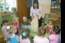 В I младшей группе №1 идет образовательная деятельность "Коммуникация". Дети учатся отгадывать игрушки по описанию. А игрушки спрятались в "Волшебный мешочек"