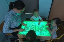 Педагог-психолог Нигматуллина Л.К. с воспитанниками детского сада проводит занятия с применением светового песочного стола. Игра с песком – это естественная и доступная для каждого ребенка форма деятельности. Метод рисования песком на световом столе не имеет возрастных ограничений и может использоваться для работы с детьми начиная с раннего возраста. Рисование песком помогает стабилизировать эмоциональное состояние ребенка, развитие тактильной чувствительности и мелкой моторики.