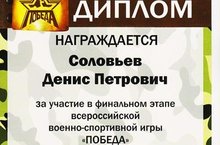 Команда Сабинского муниципального района участвовала в этом году во Всероссийских соревнованиях «Победа»! Конкурсные испытания проходили в городе-герое Волгоград. Наша команда представляла Республику Татарстан. Результатом достойной борьбы стало то, что команда вошла в пятерку лучших команд по России. В составе команды выступал ученик нашего лицея Соловьев Денис. Мы поздравляем его и желаем успехов в учебе!