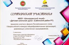 01.02.15 состоялся очный финал республиканского этапа «I Всероссийского этапа конкурса общеобразовательных организаций, развивающих ученическое самоуправление» на базе Центра «Сэлэт” г. Казань. Команда «Детская Школьная Дума» «МБОУ Шеморданский лицей Сабинского муниципального района», в лице спикера Гарипова Ильмира и вице - спикера Нургалиевой Айгуль, приняла активное участие. Ребята презентовали работу «Школьной Думы» в лицее, поделились опытом своей работы.