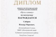 Поздравляем ученика 6А класса Сабирова Ильнура - Призера Республиканской олимпиады школьников "Путь к Олимпу" по математике и учителя математики Батыршину Лилию Назиповну с Победой! Желаем крепкого здоровья, успехов в учебе и дальнейших побед!
