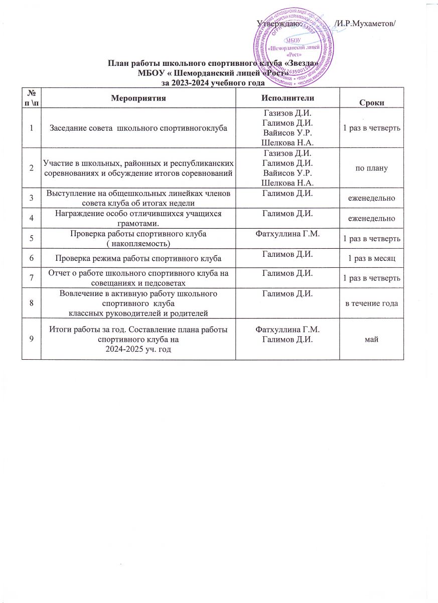 План работы ШСК "Звезда" на 2023-2024 учебный год