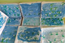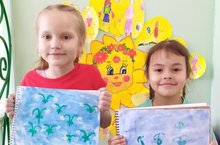 Бүген балалар белән альбом битенә зәңгәр фон биреп,ак төс белән умырзаялар ясарга өйрәндек.Балалар бик теләп тамызып чыгып,аның өстенән зур пумала белән тиз-тиз буярга өйрәнделәр.