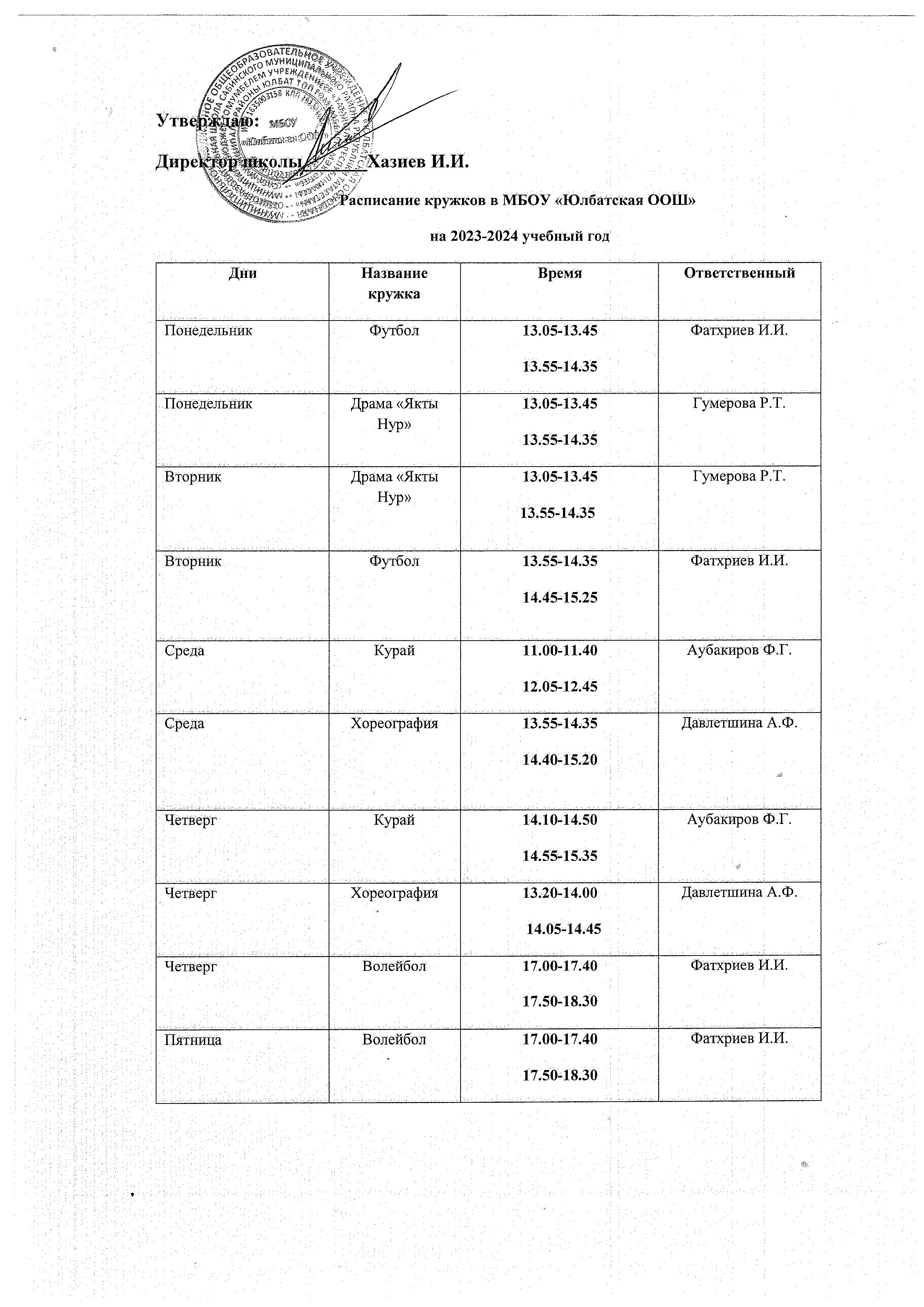 Расписание кружков МБОУ "Юлбатская ООШ" 2023-2024 уч.год