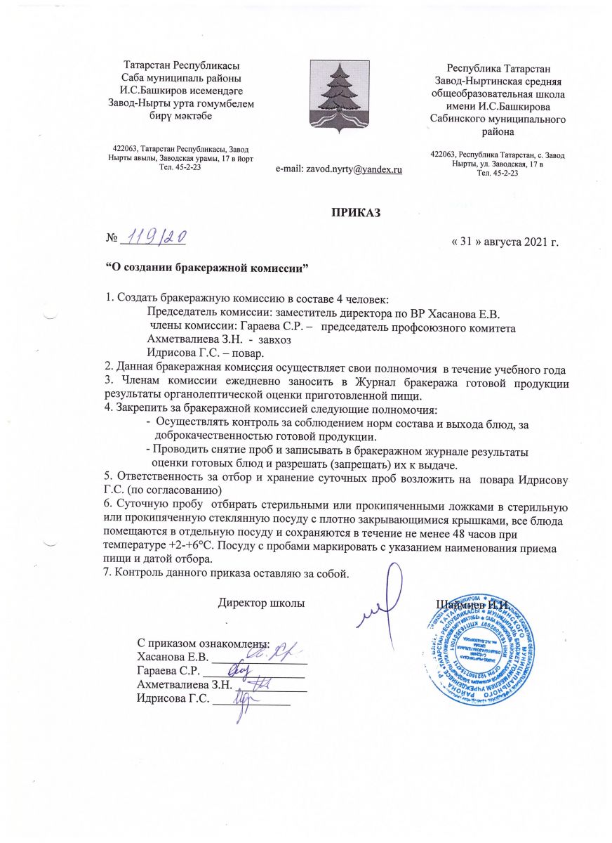 Приказ о создании бракеражной комиссии