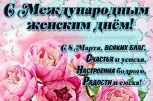 Дорогие женщины! От всей души поздравляем Вас с замечательным весенним праздником - Международным женским днем 8 марта! Пусть в Ваших семьях всегда живут мир и согласие! Желаем счастья, здоровья, благополучия и исполнения самых заветных желаний! Неиссякаемых сил, которые позволят Вам выдержать любые обстоятельства. Всегда оставайтесь прекрасными и очаровательными! Будьте всегда обаятельны и любимы!