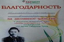 В литературно-музыкальном вечере "Безнең күңелләрдә син, Тукай", посвящённом 131-летию Г.Тукая, ученице МБОУ "Александровская ООШ" Тимербаевой Азалие объявлена благодарность от НГДУ "Джалильнефть".