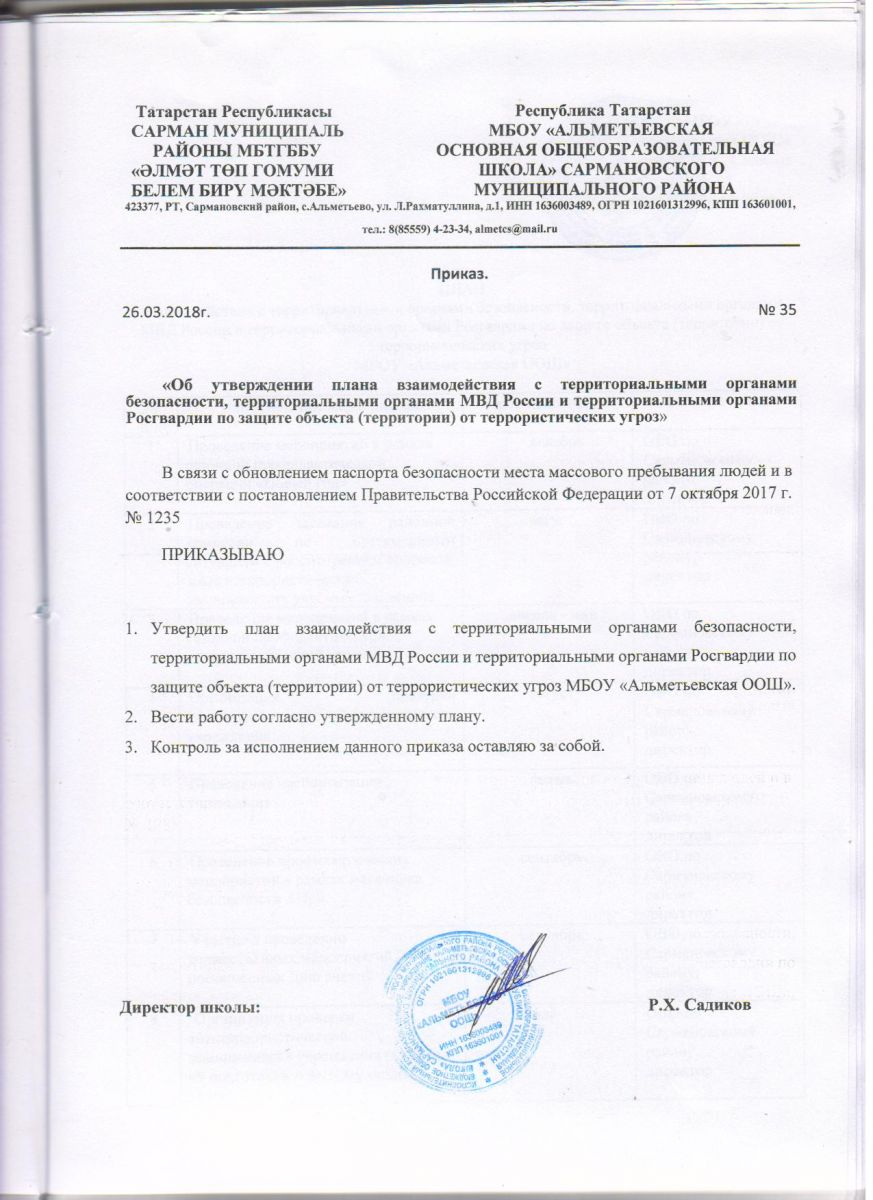 Приказ об утверждении плана взаимодействия с территориальными органами безопасности ,территориальными органами МВД России и территориальными органами Росгвардии по защите объекта(территории) от террористических угроз.