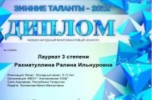 Ученица 3 класса Рахматуллина Ралина Ильнуровна приняла участие в Международном многожанровом конкурсе "Зимние таланты -2022" и стала лауреатом 3 степени в номинации "эстрадный вокал". Педагог Лукманова Иркия Махмутовна. От всей души поздравлем Ралину с победой и желаем ей дальнейших успехов! / 3 нче сыйныф укучысы Рахматуллина Ралина Илнур кызы "Кышкы талантлар -2022" Халыкара конкурста катнашып, "эстрада вокалы"номинациясендә 3 нче дәрәҗәдә дипломга лаек булды. Укытучысы Локманова Иркия Мәхмүт Кызы. Ралинаны чын күңелдән җиңүе белән котлыйбыз һәм киләчәктә дә уңышлар телибез!
