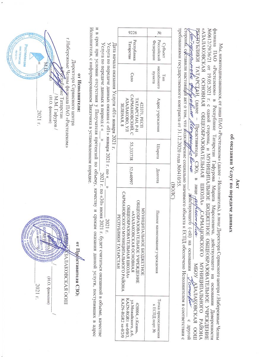 Акт об оказании услуг связи ПАО "Ростелеком"