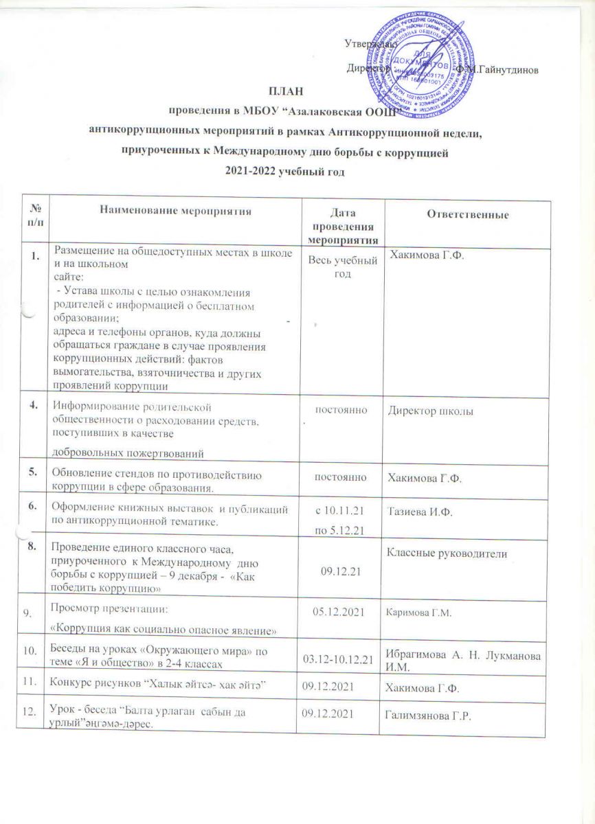 План антикоррупционных мероприятий в МБОУ "Азалаковская ООШ" в 2021 -2022 учебном году