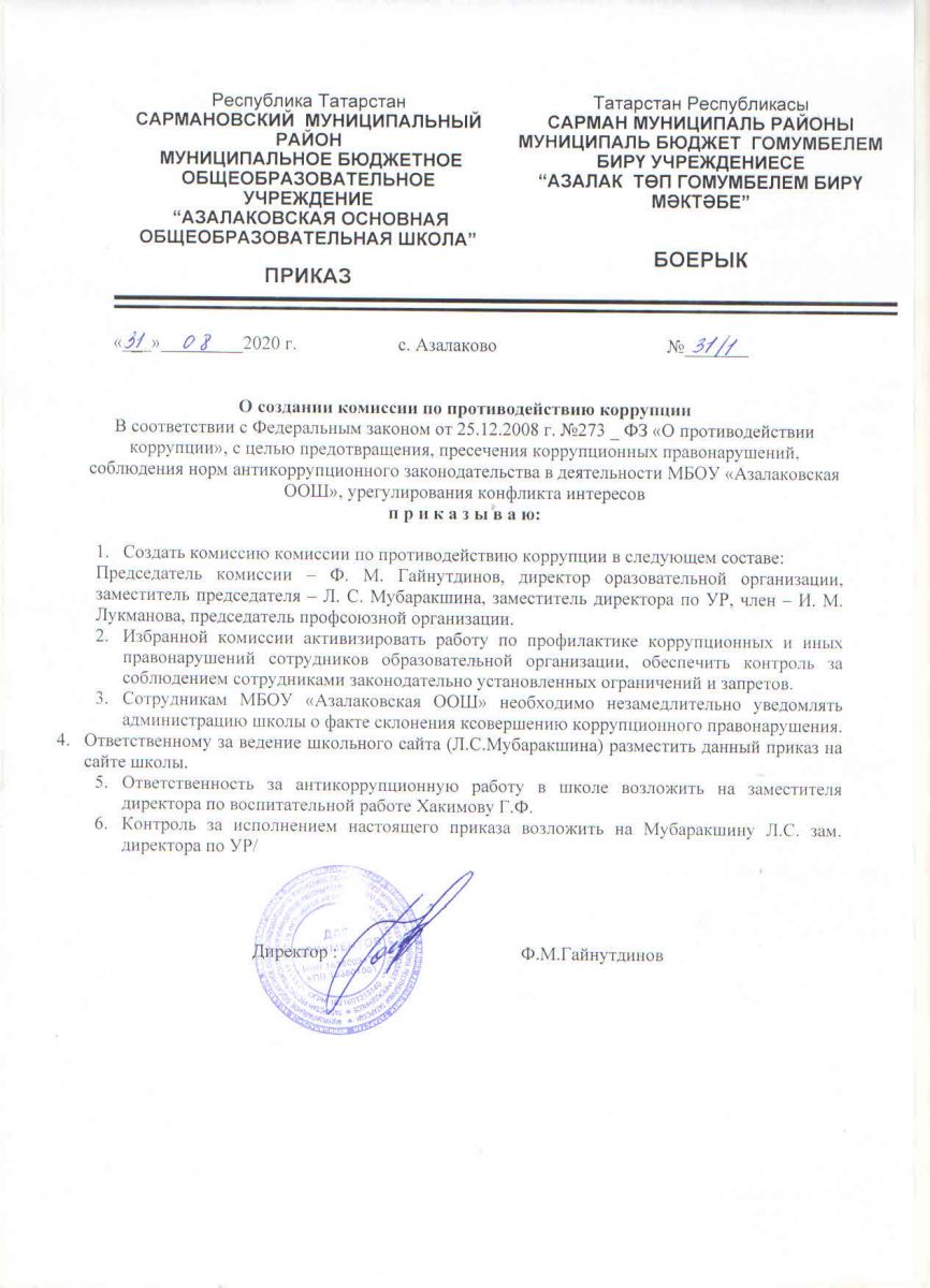 Приказ о создании комиссии по противодействию коррупции в 2021-2022 учебном году