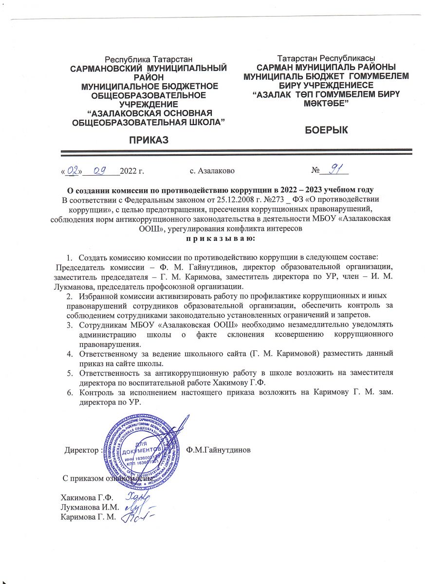Приказ о создании комиссии по противодействию коррупции в 2022-2023 учебном году