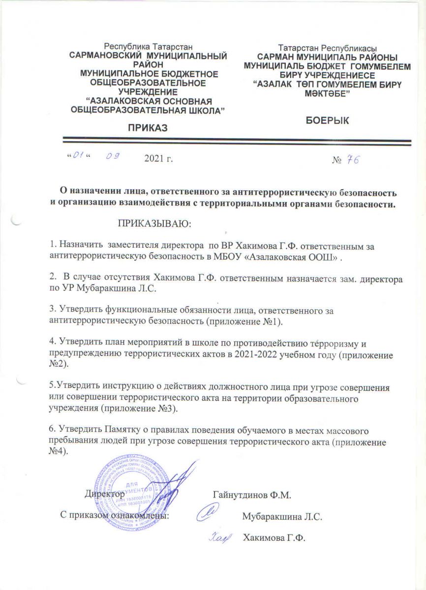 Приказ о назначении лица, ответственного за антитеррористическую безопасность