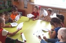Бүген «Серле кәгазь” түгәрәк эшендә балалар кәгазь үзлекләре, төрләре, кулланышы белән таныштылар. Кәгазьнең үзлекләрен төрле юллар белән белделәр: бөгәрләп, ертып, кисеп карадылар, рәсем дә ясап булуын әйттеләр. Нәтиҗә ясап, үз куллары белән, бөкләү юлы белән очыргыч ясадылар.