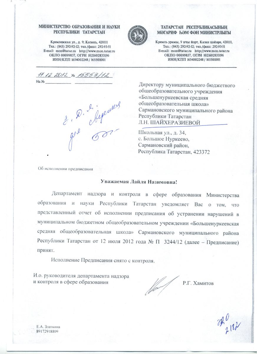 Предписание снято с контроля (17.12 2012)