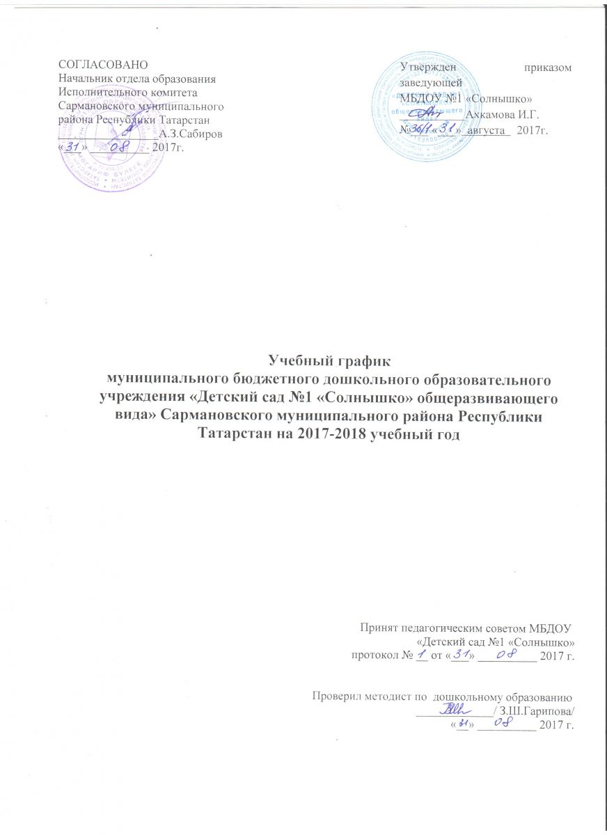 1.Настоящий годовой календарный учебный график разработан для муниципального бюджетного дошкольного образовательного учреждения «Детский сад №1 «Солнышко» общеразвивающего вида» Сармановского муниципального района Республики Татарстан (далее – ДОУ) на 2017-2018 учебный год в целях упорядочивания воспитательно-образовательного процесса.