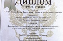 Наши педагоги Хабибуллина Лилия Федоровна и Шаймуратова Регина Ришатовна стали Победителями на Всероссийском творческом конкурсе для педагогов "Традиции народной культуры в системе духовно-нравственного и патриотического воспитания" в номинации "Предметно-развивающая среда группы" 05.02.2021