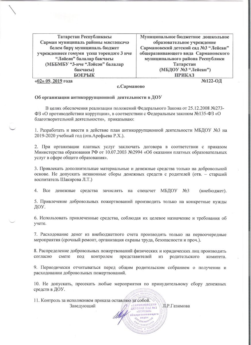 Приказ об организации антикоррупционной деятельности по ДОУ на 2019-2020 учебный год