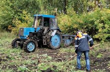 В нашем школьном саду началась уборка урожая. Родители наших учеников помогают техникой.