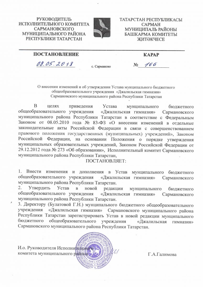 Постановление №166 о внесении изменений и об утверждении Устава,копия