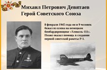 Сегодня классные часы в нашей школе были посвящены легендарному бойцу, герою Советского Союза летчику Михаилу Петровичу Девятаеву (Девятайкину). Ребята узнали о подвиге отважного летчика, который сумел со своими товарищами угнать немецкий самолет-бомбардировщик и совершить таким образом побег из концентрационного лагеря.