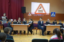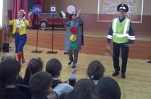 2 февраля учащиеся начальных классов встретились с артистами театра "Калейдоскоп" из г. Набережные Челны.Учавствовали в детской игровой викторине "Правила дорожного движения знать каждому положено". Делаем ребятам предостережение выучите срочно правила движения, чтоб не волновались каждый день родители, чтоб спокойно ехали по улице водители.