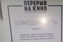 Школьный отряд "Волонтеры Победы" под руководством Асадуллиной А.М. был награжден благодарственным письмом за помощь в организации кинофестиваля посвященный Великой отечественной войне "Перерыв на кино".