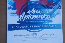 Отряд "Волонтеры победы", совместно с Юнармейцами под рукводством Асадуллиной А.М. были награждены благодарственным письмом за помощь в организации и проведении Всероссийского исторического квеста "Арктика".