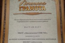 По итогам муниципального этапа олимпиады школьников МБОУ “Джалильская СОШ №2” за 1 место награждена почетной грамотой Отдела образования Исполнительного комитета Сармановского муниципального района.