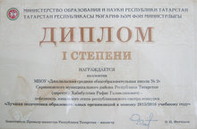 Коллектив МБОУ «Джалильская СОШ №2» стал победителем зонального этапа республиканского смотра – конкурса «Лучшая подготовка образовательных организаций к новому 2015-2016 учебному году» и награждается Дипломом I степени Министерства образования и науки Республики Татарстан.