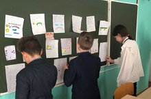 Мәктәпнең 3-4 катларында балалар, татар теленнән һәм рус теленнән сүзләрне тәрҗемә итеп, белемнәрен тикшерделәр. -