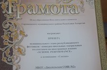 2020 елның 4 февралендә Республика "School performance" фестиваль-конкурсының муниципаль этабында мәктәп театр коллективларының чыгышына нәтиҗәләр ясалды. Безнең мәктәпнең 3-4 сыйныф укучылары театр коллективы призлы урын алды. Без укучыларыбызны котлыйбыз һәм киләчәктә дә аларга уңышлар телибез!. -