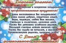 Поздравляем с Днём воспитателя и всех дошкольных работников. В Ваших руках и в Ваших силах воспитание всех поколений, Вы открываете для деток двери в страну счастливого детства и мечтаний, Вы дарите ребятам необходимые знания и возможности проявлять свои таланты. От всей души желаю Вам никогда не утратить доброты своего сердца и вдохновения к своей работе. Будьте счастливы и крепко здоровы.