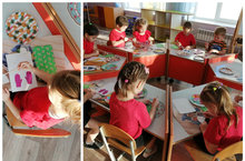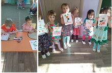 Рисование — самый популярный среди детей вид изобразительной деятельности, в ходе которого с помощью красящих материалов создаются изображения окружающей действительности. Оно знакомит детей с окружающим миром, формирует эстетический вкус, развивает креативность.Дети младшей группы украшали платье для куклы./ Рәсем-рәсем ясау-рәсем ясау эшчәнлегенең иң популяр төре, аның барышында буяу материаллары ярдәмендә әйләнә-тирә чынбарлыкның сурәтләре барлыкка килә. Ул балаларны әйләнә-тирә дөнья белән таныштыра, эстетик зәвык формалаштыра, креативлыкны үстерә. Кече төркем балалары курчаклар өчен күлмәк бизәделәр.