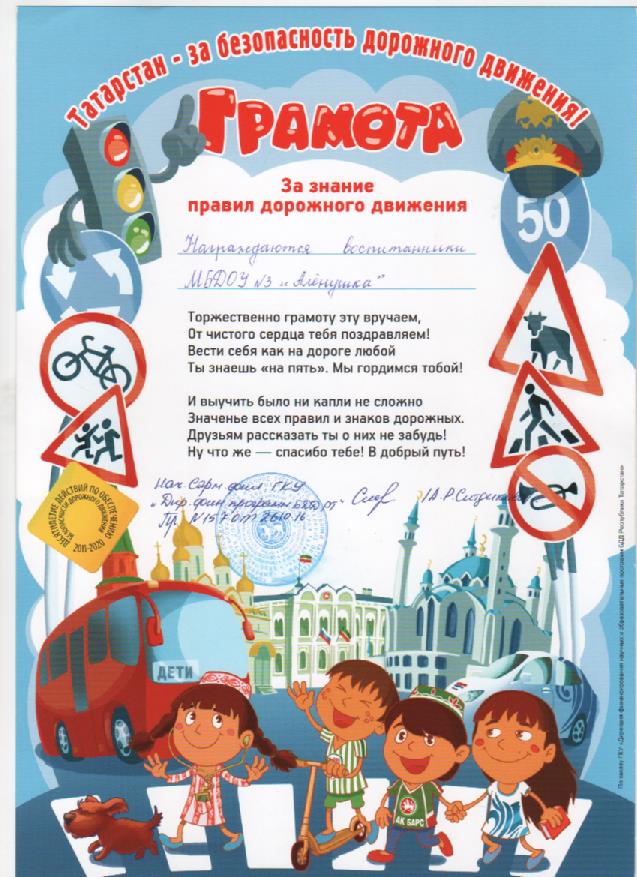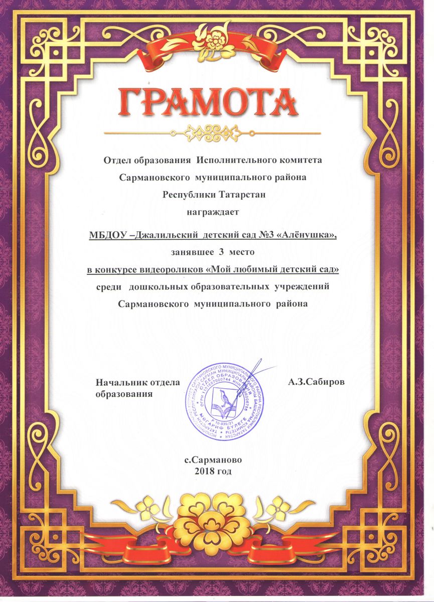 Грамота за конкурс видеороликов "Мой любимый детский сад" 2018г.