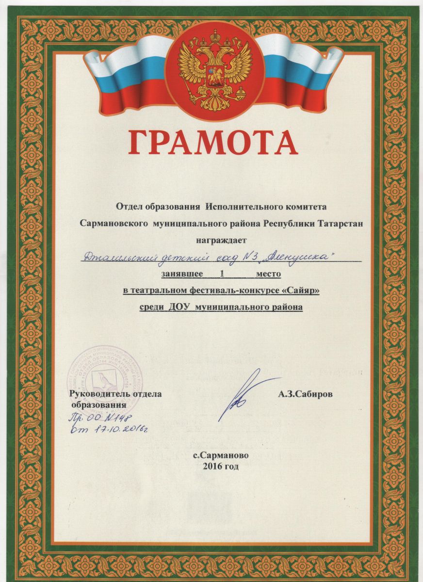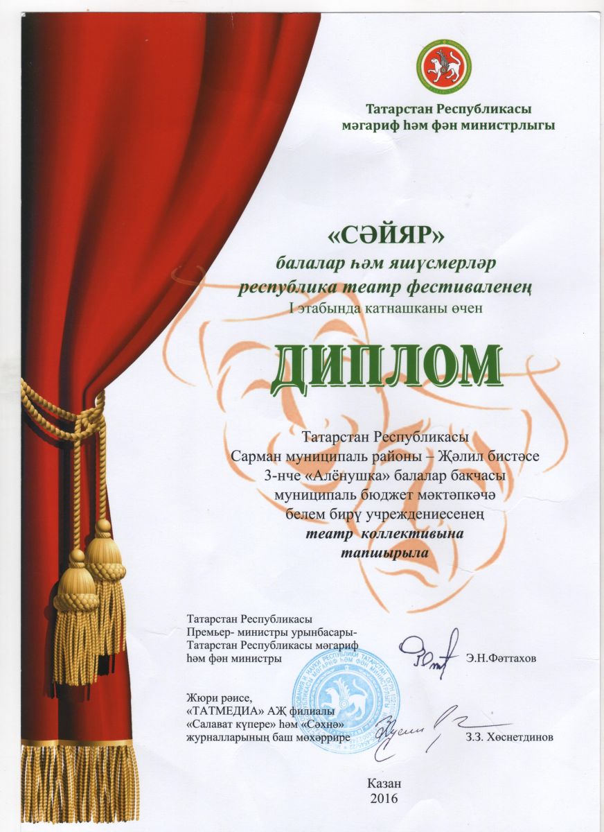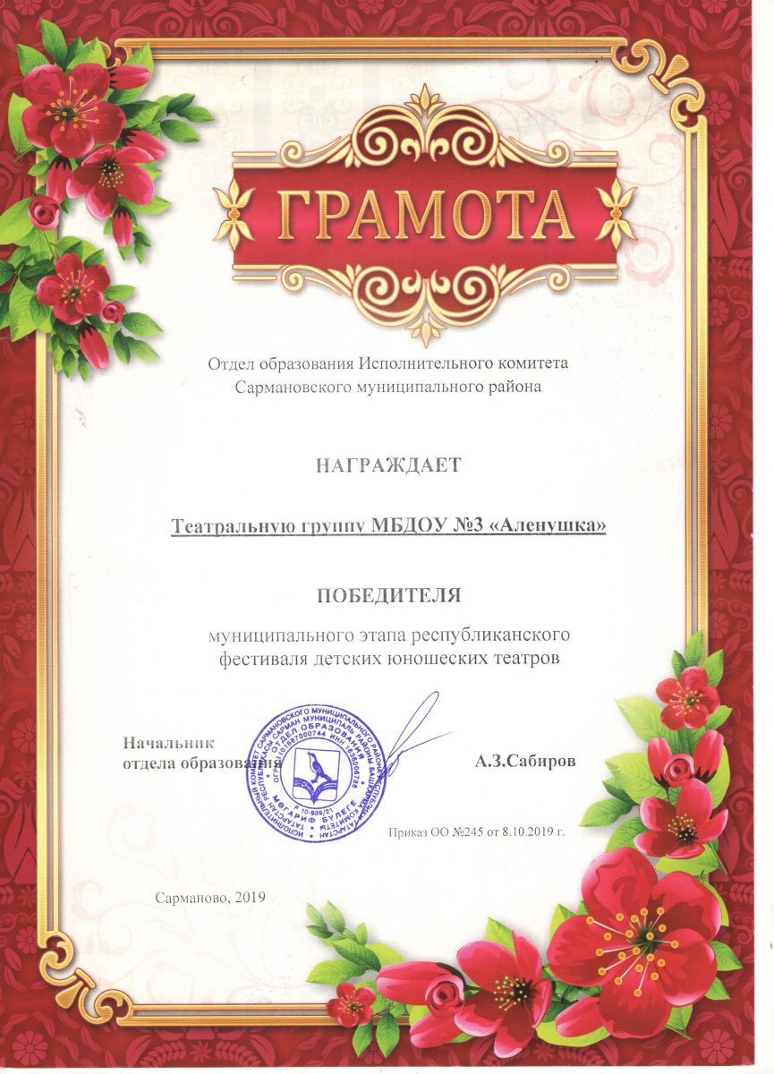 Грамота победителя Муниципального этапа республиканского фестиваля детских юношеских театров,2019