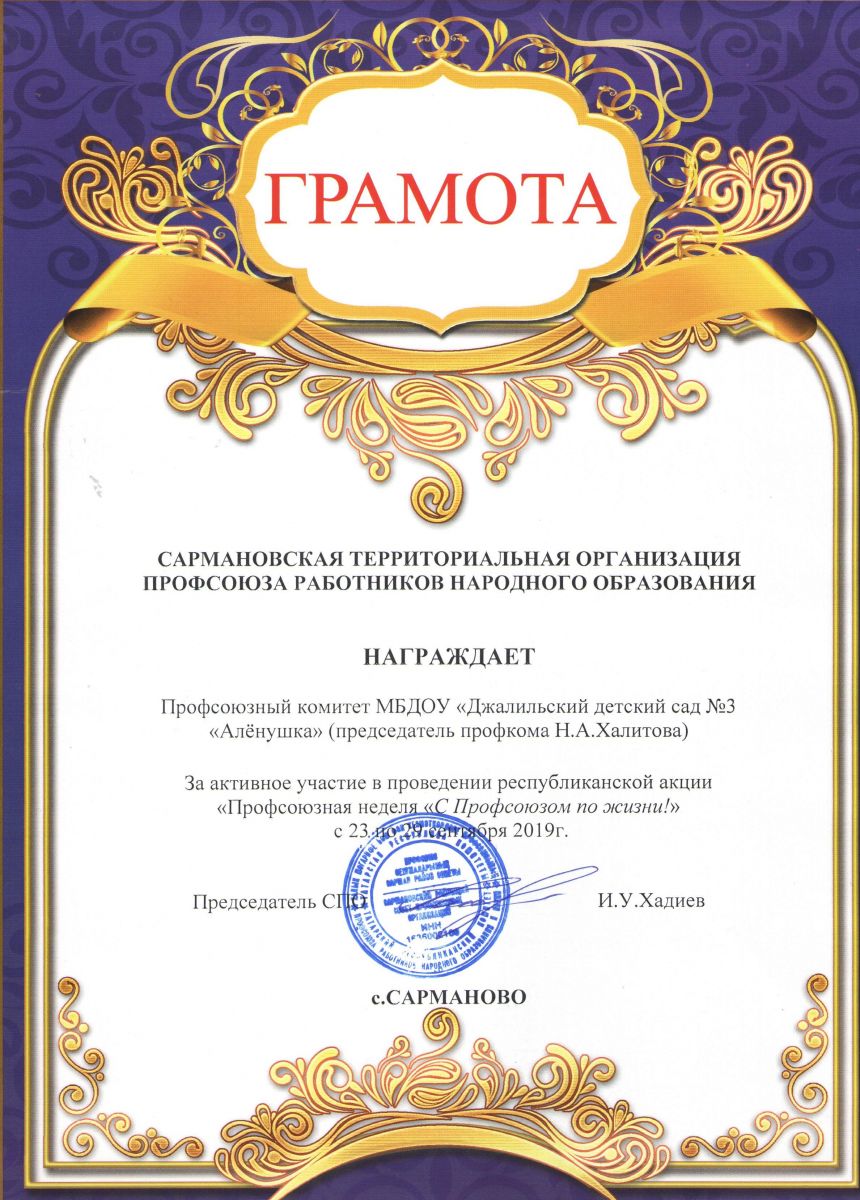Грамота за активное участие в проведении республиканской акции: "Профсоюзная неделя", 2019