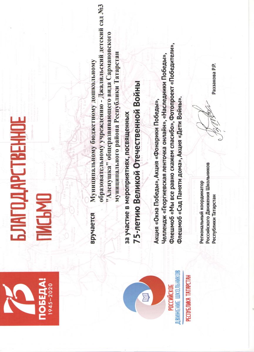 Благодарственное письмо за участие в мероприятиях, посвященных 75-летию ВОВ, 2020г.