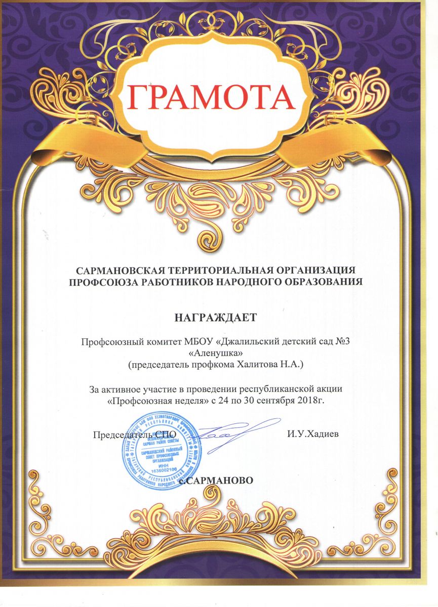 Грамота за активное участие в акции "Профсоюзная неделя" 2018г.