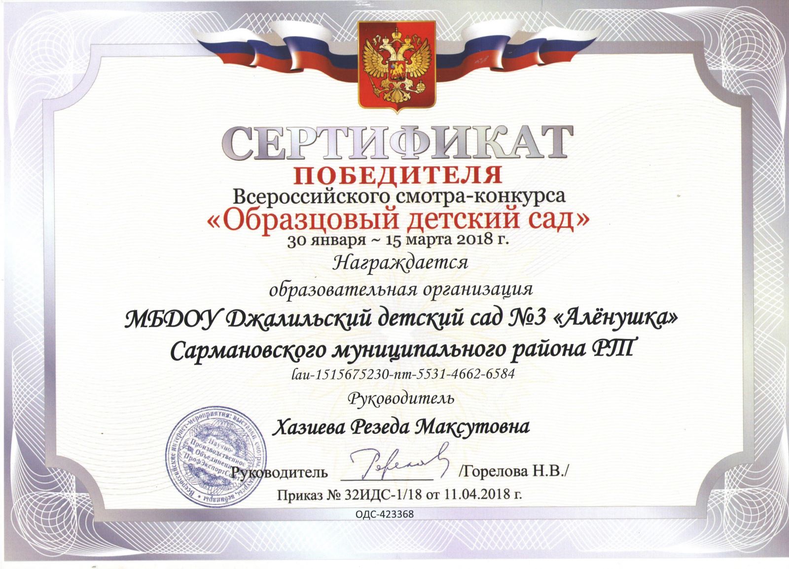 Сертификат победителя Всероссийского смотра-конкурса "Образцовый детский сад" 2018г.