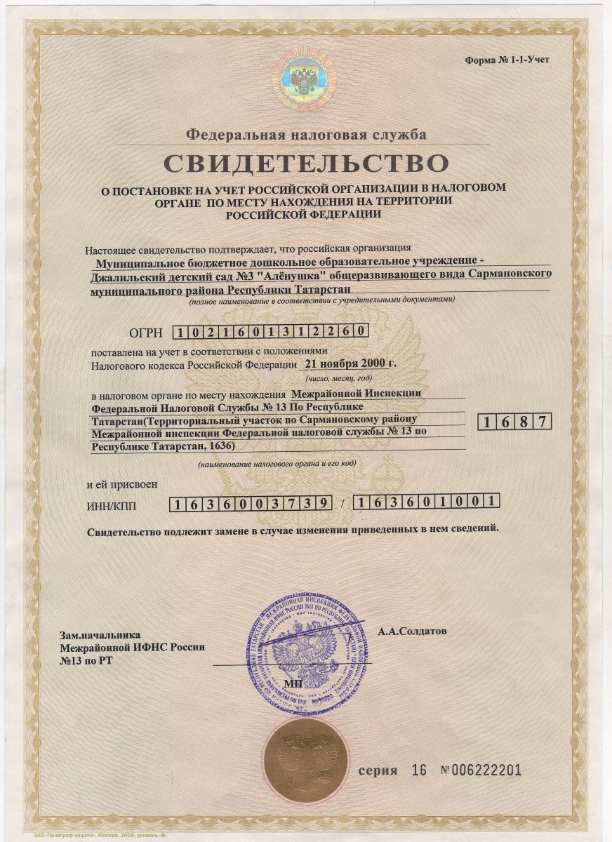 Свидетельство о постановке на учет в налоговом органе