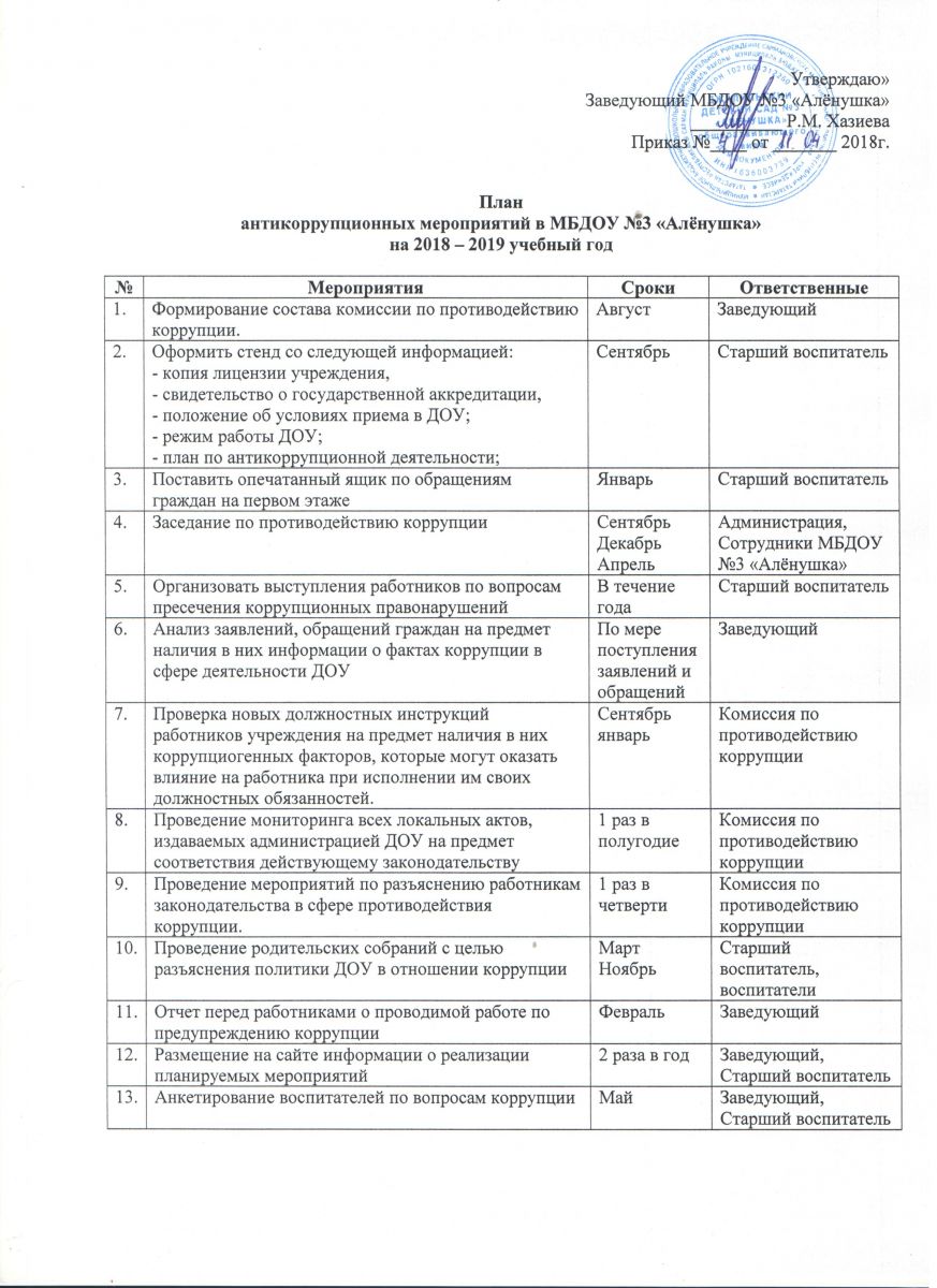 План антикоррупционных мероприятий на 2018-2019 учебный год