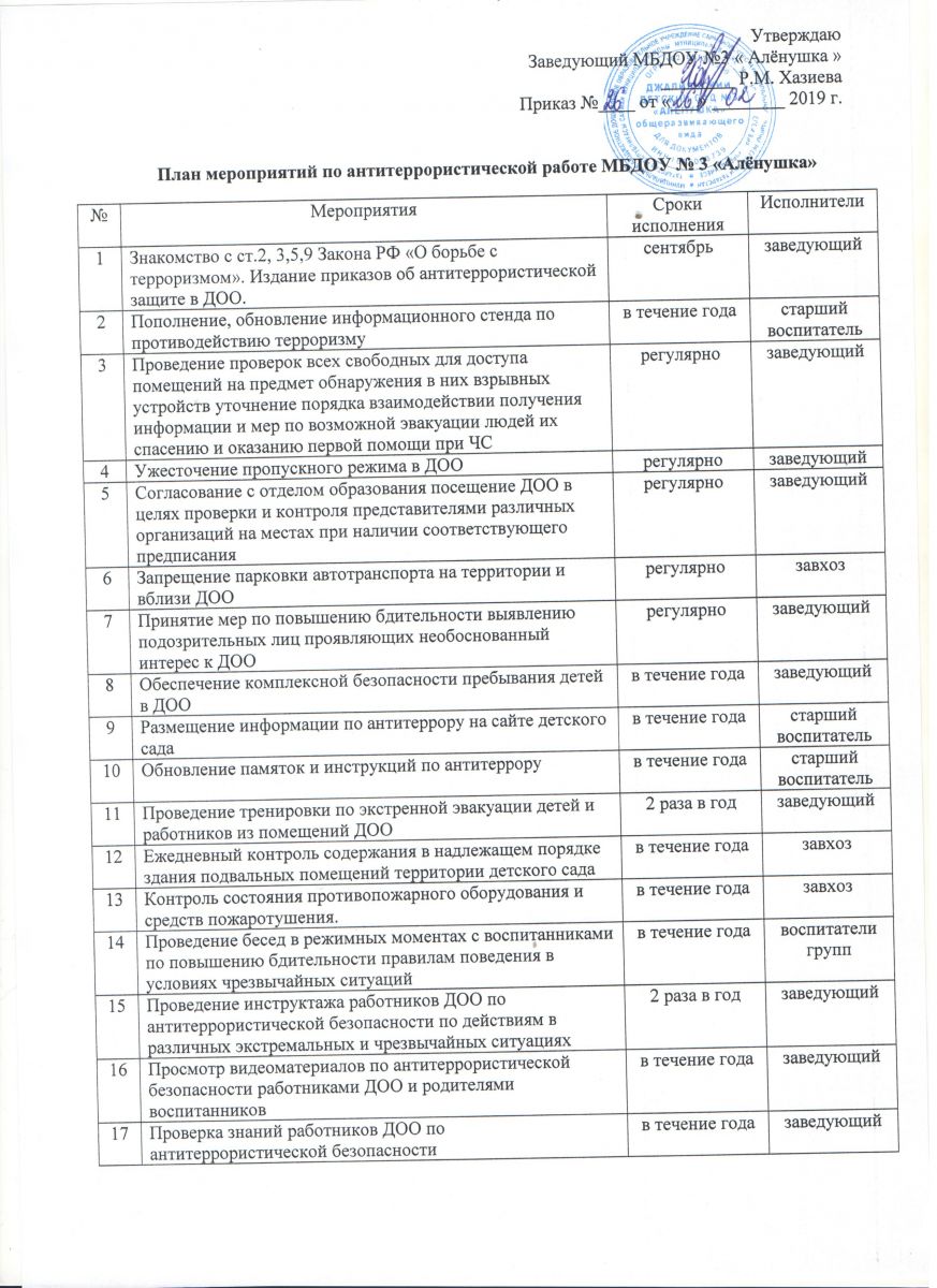 План мероприятий по антитеррористической работе МБДОУ №3 "Алёнушка", 2019г