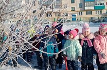 На прогулке мы с ребятами провели наблюдение за инеем. Дети стали бурно обсуждать, почему деревья покрылись белым серебром. Обобщив все предположения, сделали вывод, что иней - это капельки водяного пара, они застыли, как снежинки, узорчатые, колючие, холодные; попав на ладошку частички инея тают. Дети остались довольны своими открытиями.