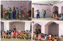 В музыкальном зале детей встречали клоуны Ириска и Анфиска, которые вместе с детьми пели, танцевали и играли.