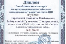 2 место на Республиканском Конкурсе на лучшую организацию работы по познавательному развитию среди ДОО в номинации “Лучшее оснащение кабинета, групповых центров по познавательному развитию” .Воспитатели Зайнуллина Г.Ш., Каримова Р.Н.