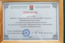 Детский сад занял 3 место в муниципальном конкурсе на лучшую подготовку образовательных учреждений к новому учебному году.\ Балалар бакчасы мәгариф учреңдениеләренең яңа уку елына иң яхшы әзерлеге буенча муниципаль бәйгедә 3 урынны алды.